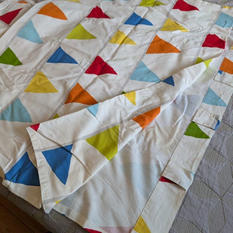 118 x 176 brukt som gardin og lagt opp, noe bleket 6 cm opplegg nede og ca 5 cm oppe