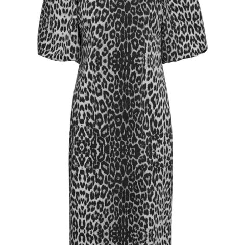 Kul kjole med dyreprint. Kjolen har krage og ballongermer som går til albuen. Glidelås bak. Knelengde. Materiale: 74% Viskose, 20% Polyamid, 6% Elastan