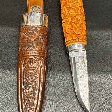 Typen går vel under " Grini kniv " men usikker om disse er lagd under okkupasjonen av Norge og på Grini fangeleir eller er etterkrigs . De koster 1200 kr for den til venstre og 850 kr for den til høgre en samlet 1800 kr . Kan byttes i eldre bein kniv eller utskjært trekniv .