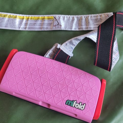 En vanlig bilstol hever barnet opp slik beltene passer barnet, denne trekker beltene ned slik at de ligger riktig over barnet. Ekstremt kompakt (23 cm langt, 12 cm bredt, 5 cm høy, veier en liten kilo), så denne er fin å ha med på reise. Denne er godkjent for bruk for 15-36 kg, men jeg anbefaler denne brukes som en reserveløsning om man ikke får tak i en skikkelig bilstol når man er ute på tur eller om man skal ta en kortere taxitur. Sikkerhetsmessig vil jeg si at denne er midt i mellom det å ikke bruke bruke bilstol og en faktisk bilstol. Lett å bruke, med bruksanvisning på selve bilstolen.