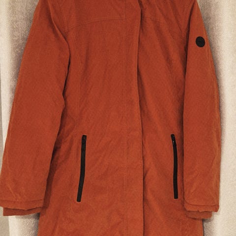 Jakke som lukkes med glidelås, skjult bak klaff med knapper. Fast hette med fuskepels. Enhåndsstramming ved halsen. Lommer foran på begge sidene, lukkes med knapp. Lange ermer med to knapper ytterst. Supermykt og pusete stoff på innsiden av jakken.