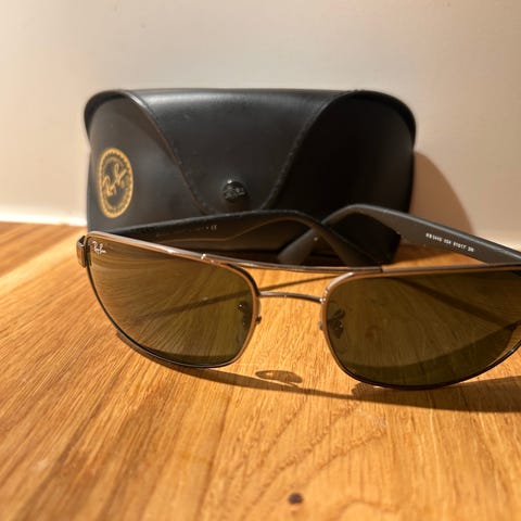 Pent brukte originale Ray-Ban solbriller med gullinfatning, brunt glass og etui. 14 cm mellom stengene. Voksenstørrelse.