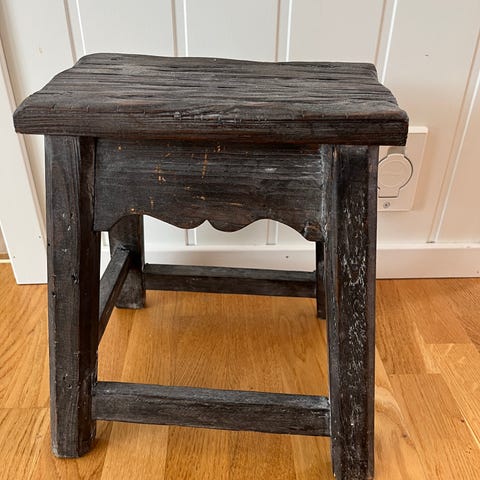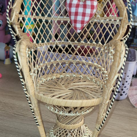 Denne pene stolen er håndlaget, og passer til en nisse eller en dukke som skal sitte på stas. Stolen er malt mørk grønn og setet er vevd for hånd. Det finnes bruksspor, men de er få og ikke skjemmende. Se bildene! (Bamsen er kun til illustrasjon, ikke salg.) Høyde: 30 cm. Høyde t.o.m. setet: 13,5 cm. Bredde: 13,5 cm. Dybde: 12,5 cm. Vekt: 201 g.