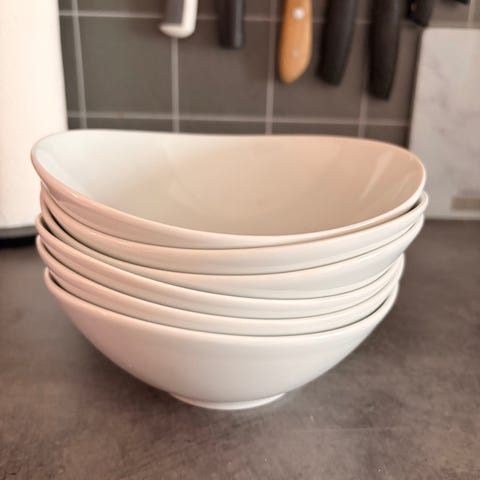 Fem skåler i en frisk grønnfarge. 8 cm høy, 15 cm omkrets. Uskadet og knapt brukt.
