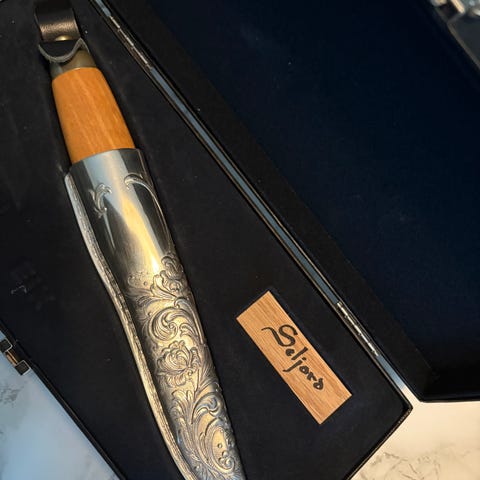 Bunadskniv med tradisjonell og vakker dekor både på skaftet og på slira . Bjørk i skaftet.
