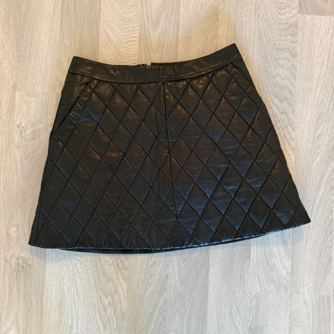 Lekkert skinnskjørt i A-fasong i sort. Lukkes med glidelås bak. Kort i fasongen og normal i størrelsen.