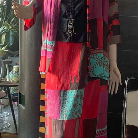 Dette er finsk vintage drakt i semsket skinn. Fin kvalitet. Fin stand, men må alltid ta høyde for at det er brukt. Ingen spesielle flekker eller veldig synlig slitasje. Flott jakke i lin av høy kvalitet. Nydelig sennepsgul farve. Str 36. Selges samlet.