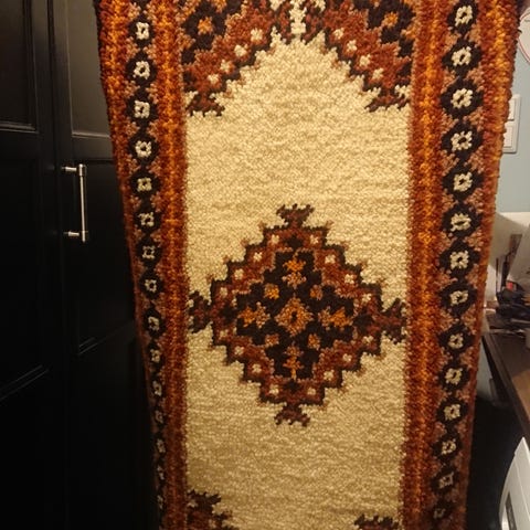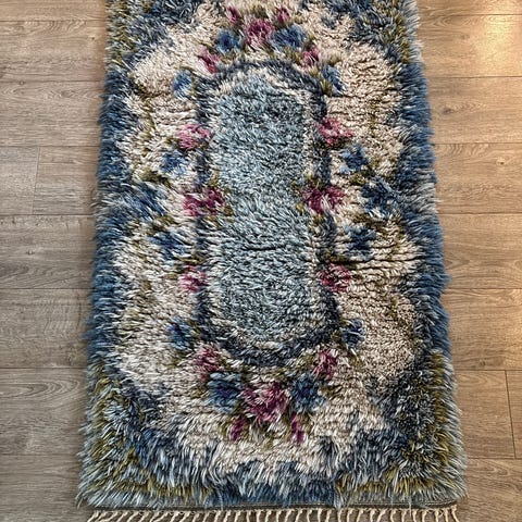 Kjempefint ryeteppe fra 60-70-tallet. Håndknyttet i ull. Kan også brukes som dekor på veggen.