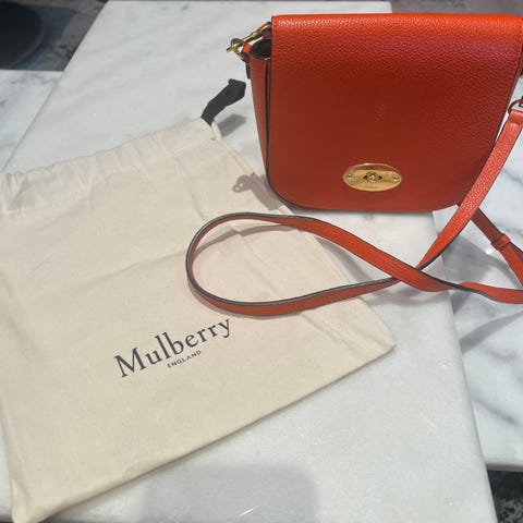 Ubrukt Mulberry clutch, semsket skinn , overgang skinn rød blankt til semsket dus rød/rosa. Bredde nederst ca 21 cm, øverst ca 21 cm. Høyde ca 13,5 cm, dybde ca 2 cm.
