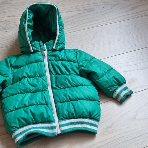 Grønn boblejakke fra Cubus, str 110. Ikke den tynneste, men lett og fin. Avtagbar hette. Hempa er ødelagt. Pent brukt.