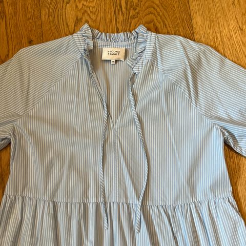 Nydelig sommerkjole fra Second Female i str M. Lys blå med rødoransje, sort og hvitt mønster. Fine detaljer; rysjer, knapper bak. Bør sys noen få sting i skjæringspunktet i utringningen foran, men det vises ikke at det holder på å gå opp. Veldig fin, ingen flekker.