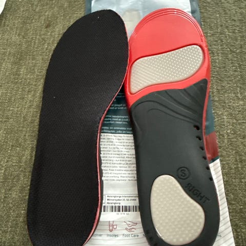"Sålen har tre ulike densiteter av TPE-gel som gir støtte og demping til hele foten, til og med sidene, gjennom hælkappen. Oppbygd støtte for mellomfoten gir deg god stabilitet. Yttersiden er laget av polyester og bambus. Kan håndvaskes"