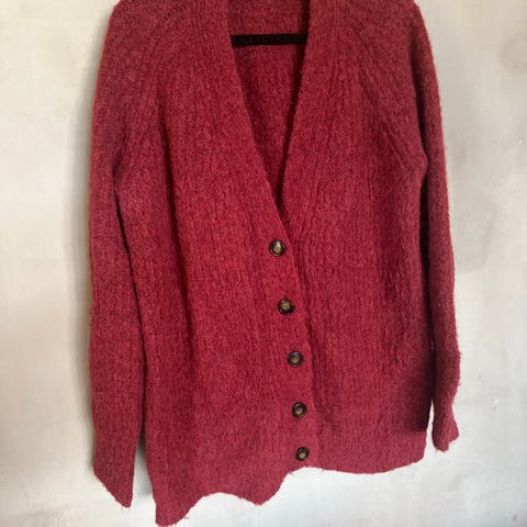 Spesiell og fin strikke-jakke med belte. Det er et ekstra lag øverst på ryggen som gir volum og kul passform.