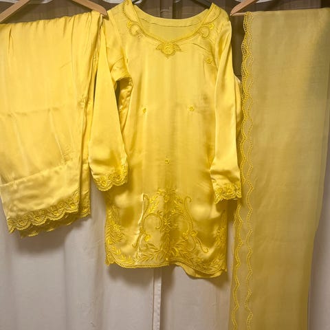 Antrekket er laget av høykvalitet silkestoff og har utsøkt håndbrodert design. Pris er fast som er oppgitt i annonsen!!