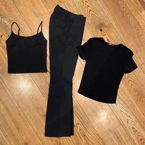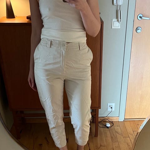 Bukser med cropped lengde og rette ben. Topp som hører til, de to båndene kan knytes slik du ønsker. Viscose materiale og anvendelig både sommer og vinter. Størrelse 36.