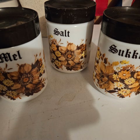 Selger 6 store krukker. Mangler et lokk og to lokk er limt.