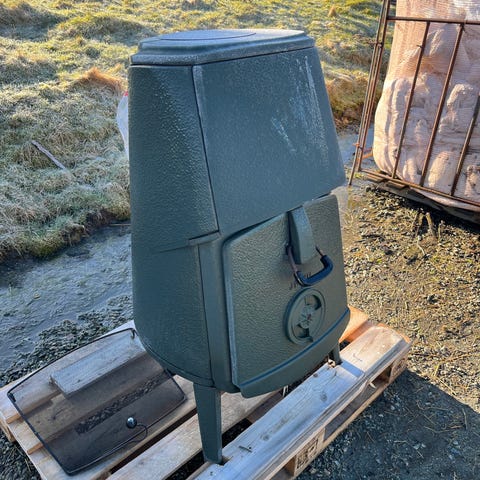 Emaljert støpejernsovn/kamin med røykrør.