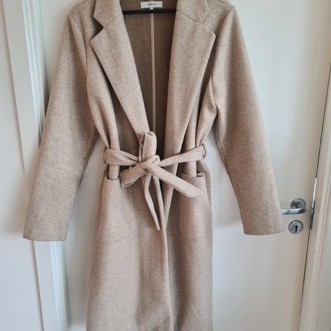 Feminin omslagskåpe i 100 % tett strikket ull selges. Stoffet er litt elastisk, det ser ikke strikket ut. Kåpen knyttes med et belte i kåpestoffet. Den kan også brukes uten beltet.