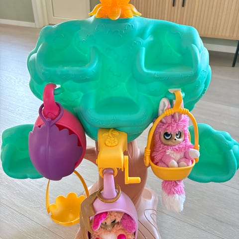 Søt rosa Bush baby som bor i et tre. Den har fungerende heis, sovehule og huske. Blomsten i toppen lyser. Bamsen har et rom i bakhodet med plass til en finger. Slik endrer man vinkelen på øynene for å skape morsomme ansiktsuttrykk.