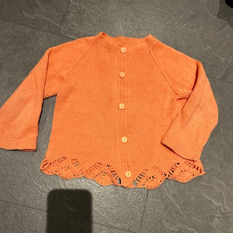 Nydelig hjemmestrikket jakke i str 4 år, den er strikket i 100% ren ull og fargen er offwhite med røde stjerner.
