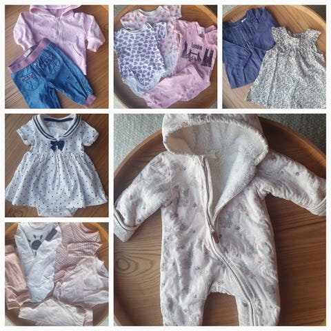Selger en stor pakke med babyklær i størrelse 62 – over 30 plagg! Perfekt startpakke for en liten jente eller unisex bruk. Alle klærne er brukte, men i god stand.