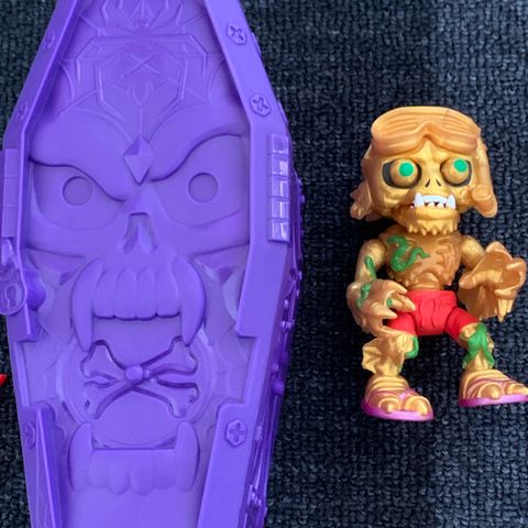 Treasure X Monster gold. Når du følger beskrivelsen, spretter etterhvert monsteret ut fra kista. Morsom å leke med også etter at oppgavene er løst. Det er 6 forskjellige samlefigurer å finne. I noen av kistene er det en figur dyppet i gull.