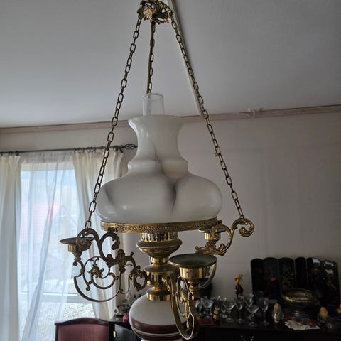 En fin lysekrone selges. Alle lyspærene fungerer helt fint, og den er klar for montering.