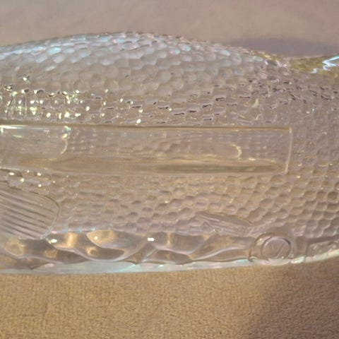 Kraftig karaffel i grønnaktig glass formet som fisk