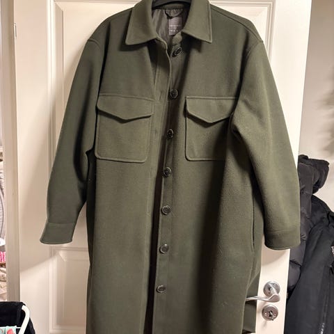 Selger en lang jakke fra Floyd, som har en nydelig grønnfarge for kr 200,-.