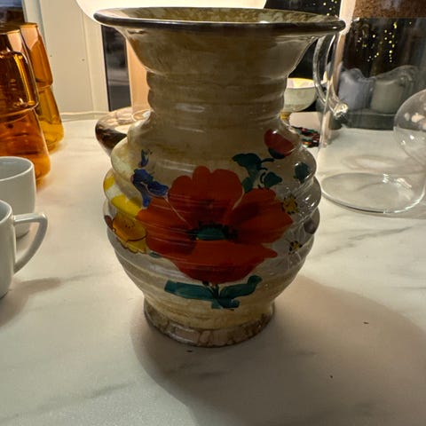 Liten vase grønn og ferskenfarget settekasse asiatisk vintage retro