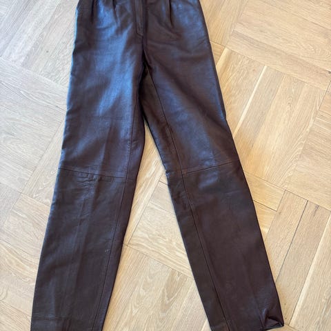 Vintage, varm, mørk brun skinnbukse med legg i forkant og belte hemper. Det er litt høyere liv på buksen, den har en rå kant nederst på beina, før har den blitt teipet opp, for rett lengde, som gjør at det er mulig å brette den opp, eller klippe av mer stoff, for riktig lengde.