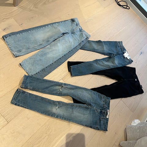 3 veldig gode gensere. 2 stk like , bare forskjellig farge( brun & blå) Og en beige farget med kul figur på armen . Str 128 og 140. Alle nesten like i størrelse.