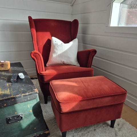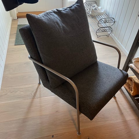 Pent brukt lenestol fra Fagmøbler. Armlene og ben er svart metall. Finner den ikke på nettsidene lenger. Tror modellen/ stolen er utgått.