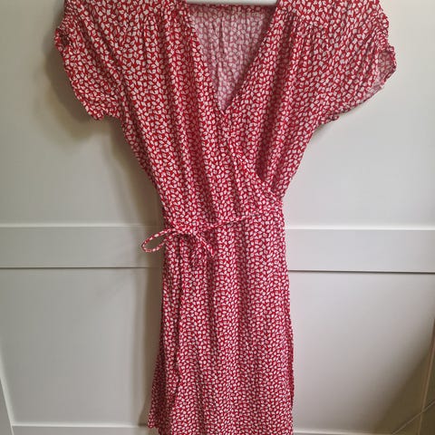 Pent brukt. Nydelig rød farge med hviteblomster. Viskose og polyester. Behagelig stoff.