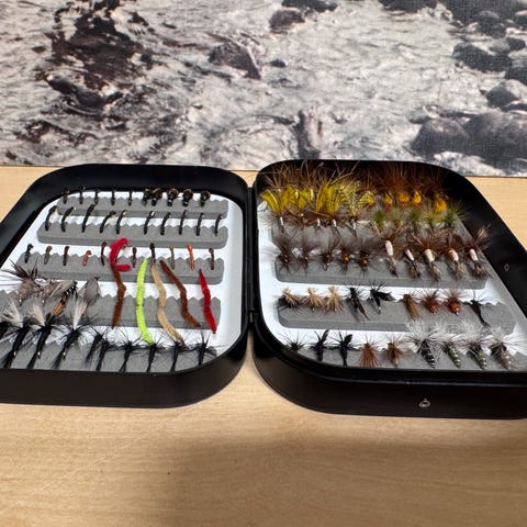 Primært ørretfluer og sjøørret fluer + noe laks.