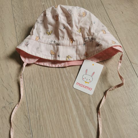 Helt ny solhatt fra Benetton i str. 62 cm. Rosa/hvit rutete solhatt med reim som festes med borrelås.