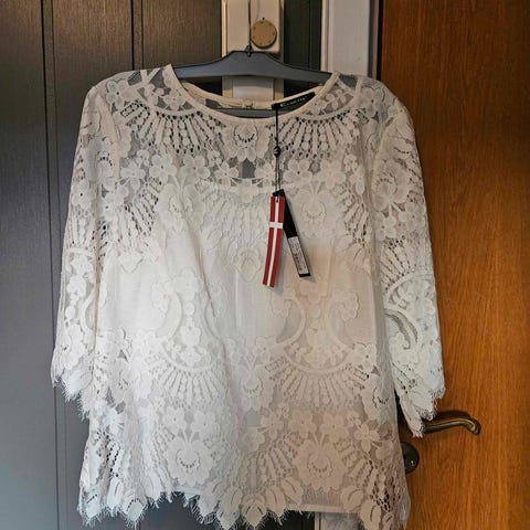 Lite og pent brukt bluse med fine detaljer. Rysjekant nederst på mansjetten og logo (en liten fe) brodert nederst på venstre side (se bilder). Blusen er bittelitt innsvingt og normal i størrelsen. Lett og luftig stoff i 96% bomull og 4% elastan som gir litt stretch. Nypris var ca 1100😊