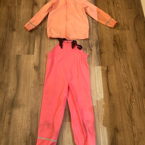 Regnbukse og jakke i str 128. Hetta på jakka har 2 små rifter - ellers helt og i god stand.