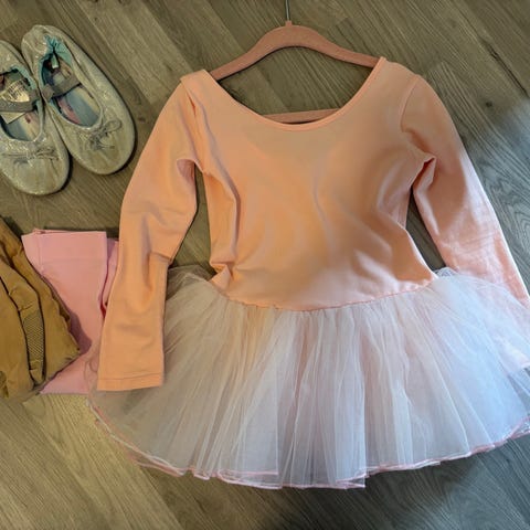 Et dansesett som består av dansekjole og skinnsko. Skoene er ca str 30