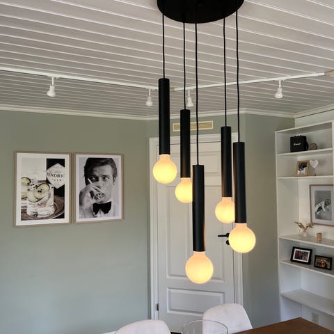 Ledning er kuttet til 60 cm, så maks lengde fra taket til bunn av lampen er 90 cm.