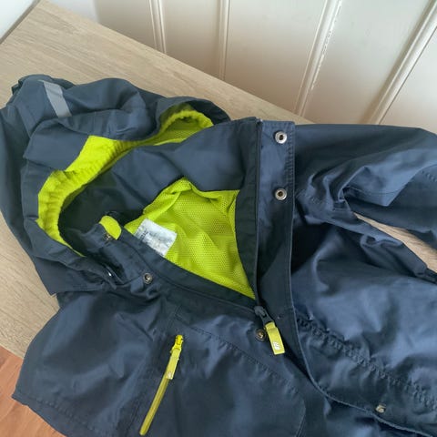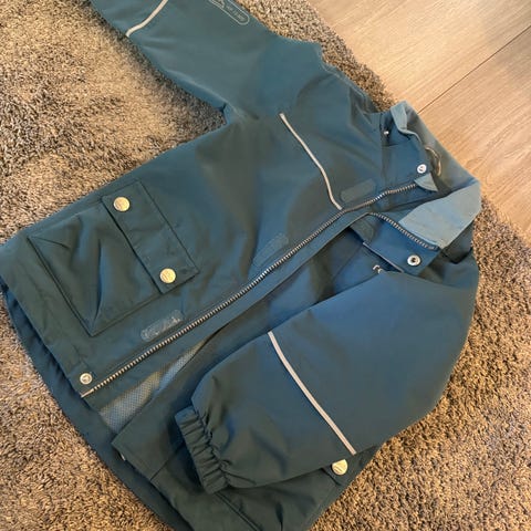 1 grønn ,fleeceforet regnjakke Didrikson med avtagbar hette. Refleksdetaljer på armer og nederst på jakka. Str 120