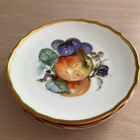 6 stk asjetter med fruktdekor og gullkant fra Egersunds Fayancefabrik. Produsert mellom 1954 og 1963. Pris 100,- per stykk eller 500,- samlet.