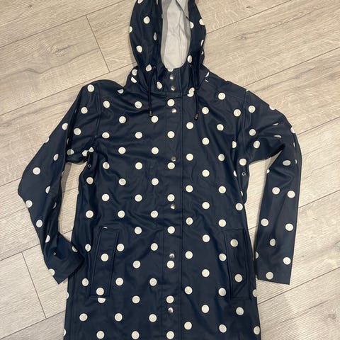 Regnkåpe i meget god kvalitet fra Brandtex, i str 36/38. Ubrukt og med lappen på. Mellomblå med mønster i svart. Mange fine detaljer.