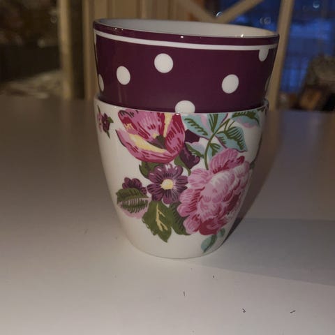 Selger 10 stk kopper og 4 stk tilhørende skjeer. Selges da de ikke blir brukt.