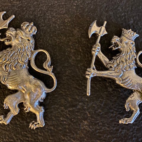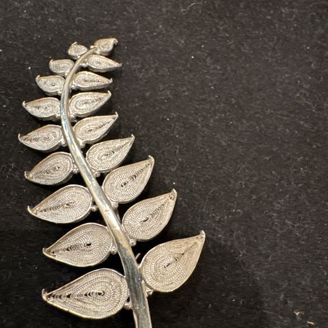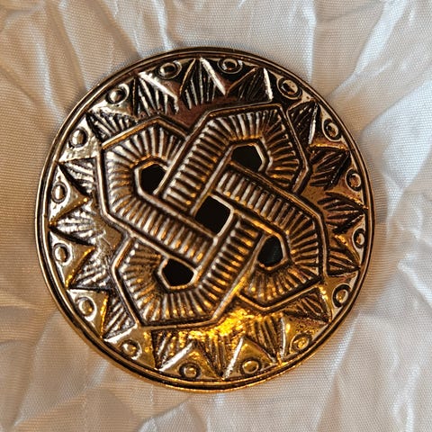 Selger er flott brosje med domkirkehode av Henrik Møller, Trondhjem.