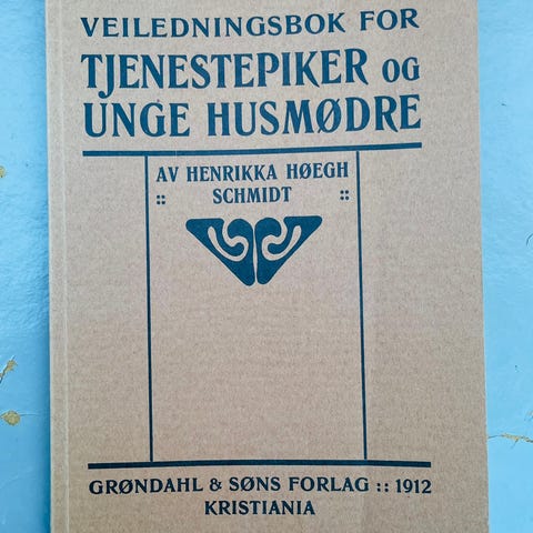 «Veiledningsbok for tjenestepiker og unge husmødre» av Henrikka Høegh Schmidt selges for kr 45,-.