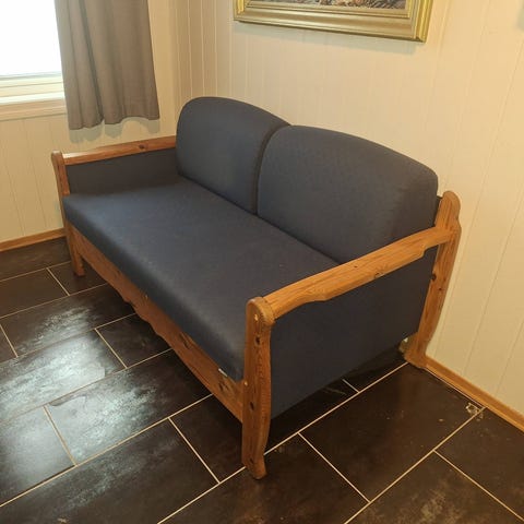 Sofaen gis bort på grunn av omdisponering av rommet.