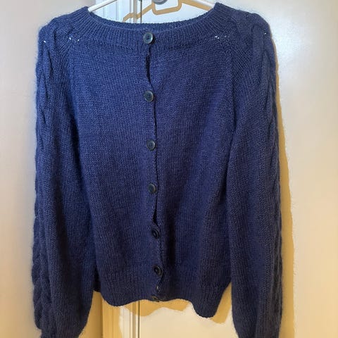 Nystrikket Olive Cardigan fra Knitting for Olive i XS. Strikket i én tråd Sandnes garn Sunday og én tråd Sandnes garn tynn silk mohair. Begge i fargen Jolly Blue. Cardigan er kun prøvd på.