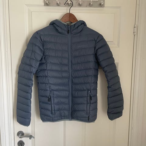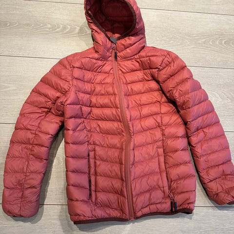 Selger ei rosa Jotunheim dunjakke jr, Blåhø, str. 164. Du kan se noen bruksmerker, men hel og i orden og mye bruk igjen. Den svarte plasttuppen på glidelåsen i front har falt av (se bilde), men ingen betydning for bruk. Reparert et lite hull med bot fra sportsbutikk nederst på venstre erme. Er på baksiden av ermet og dermed lite synlig. Passer godt til vår og høst, lett og god jakke.