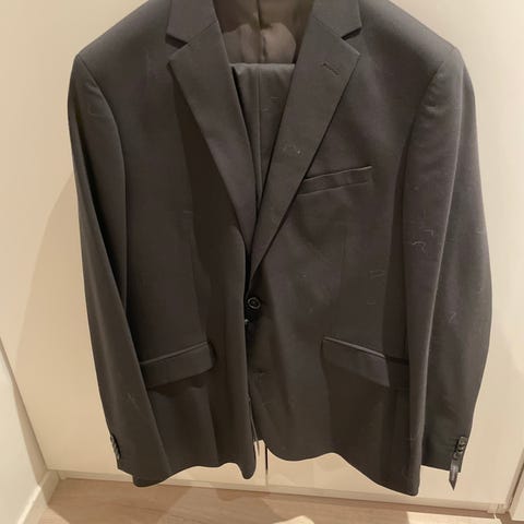 Selger svart dress, med ruter, fra Riccovero. Består av jakke, vest og bukse.